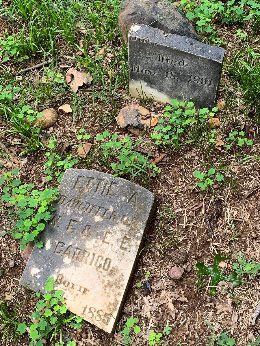 Elizabeth E. Carrico, died 1805, age unknown (wife of William) Musea D. Carrico, Born 1873, Died June 17, 1894 One unknown person with death date of May 28, 1907 (stone is broken) |