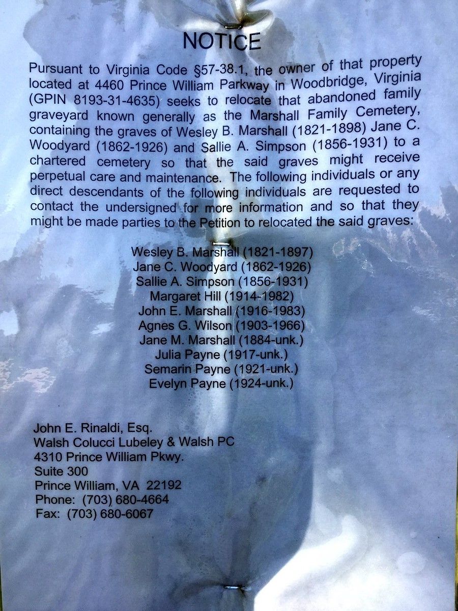 | Surnames Listed on Markers: | Wesley B. Marshall 1821 – 1898 Jane C. Woodyard 1862 – 1926 (daughter of Wesley) Sallie A. Simpson 1856 – 1931 (daughter of Wesley) |
