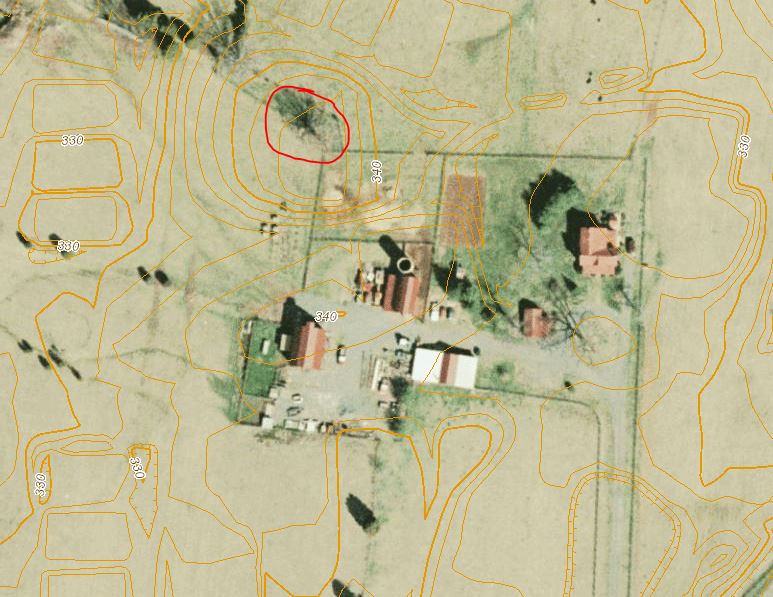 If there was a cemetery on the farm property which you would think there would be based on the age of the farm and lack of knonwn off-site burials, the most logical place for it to be would be where it's thought to be today, near the large tree. That area seems to have been the highest elevation on the farm, it's always been cleared but not farmed from aerial images that only go back to 1937, 30 years after John McCuin's death. The image below is from 2000, prior to the farm being redeveloped. The red circle indicates the area where a cemetery is thought to be or have been.
