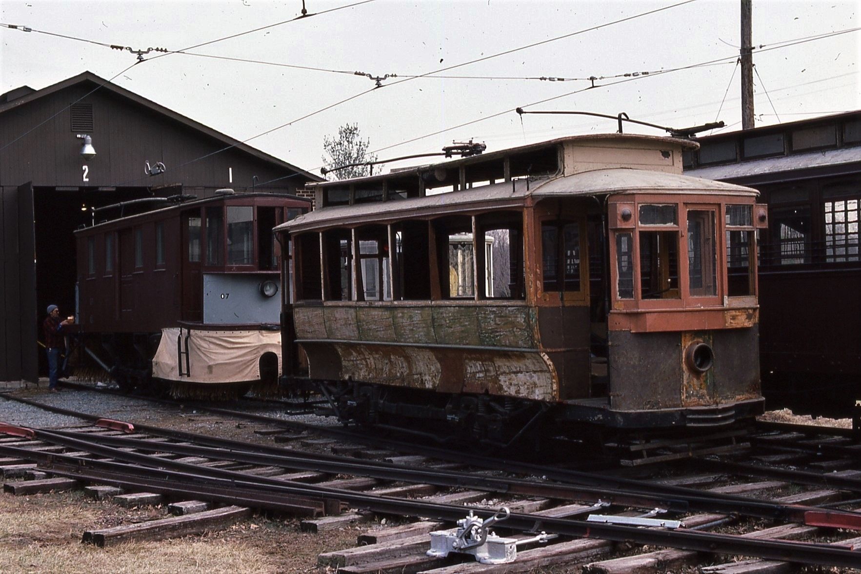 NCTM Wheaton, MD #766 and #1101 Visitor Center, Both ex-capital Transit, #766 made by Kuhlman 1919, former capital traction car #27, Dodge loop. March 1987 - #74