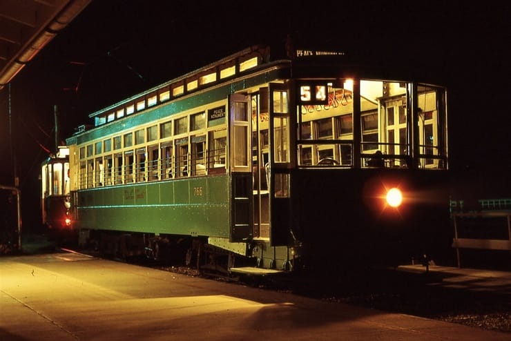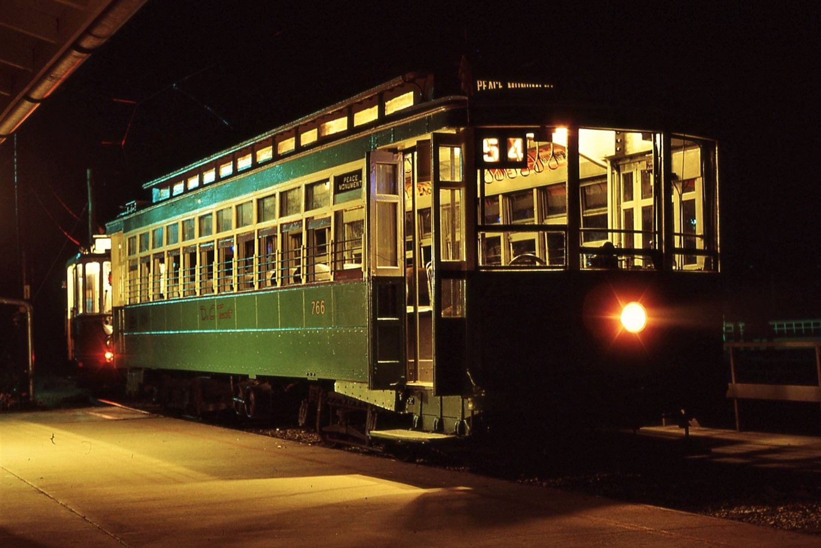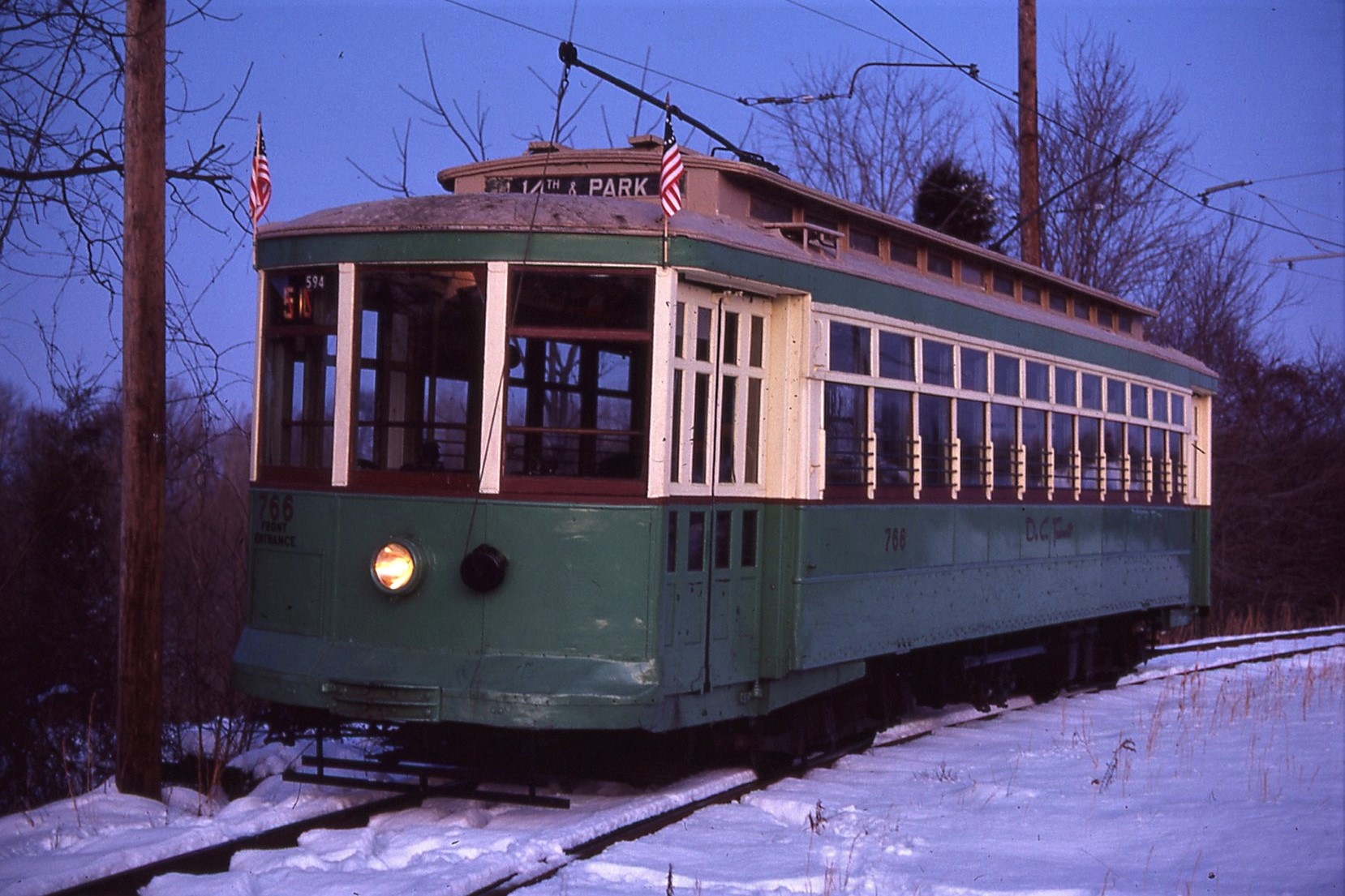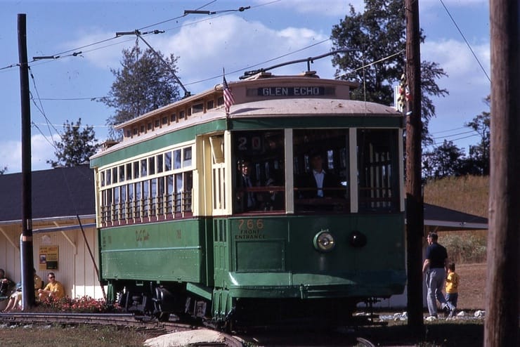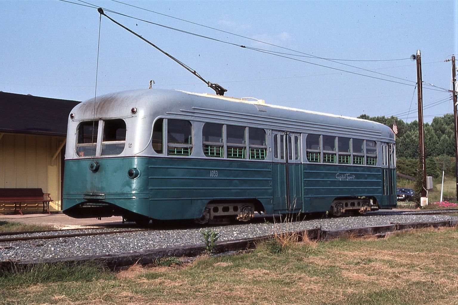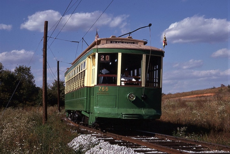 NCTM Wheaton, MD #766 and #1101 Visitor Center, Both ex-capital Transit, #766 made by Kuhlman 1919, former capital traction car #27, #1101 made by St. Louis PCC car 1937. taken March 1987 - #71