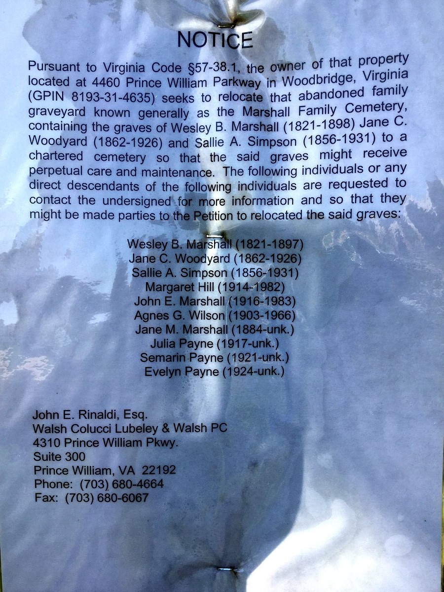 | Surnames Listed on Markers: | Wesley B. Marshall 1821 – 1898 Jane C. Woodyard 1862 – 1926 (daughter of Wesley) Sallie A. Simpson 1856 – 1931 (daughter of Wesley) |
