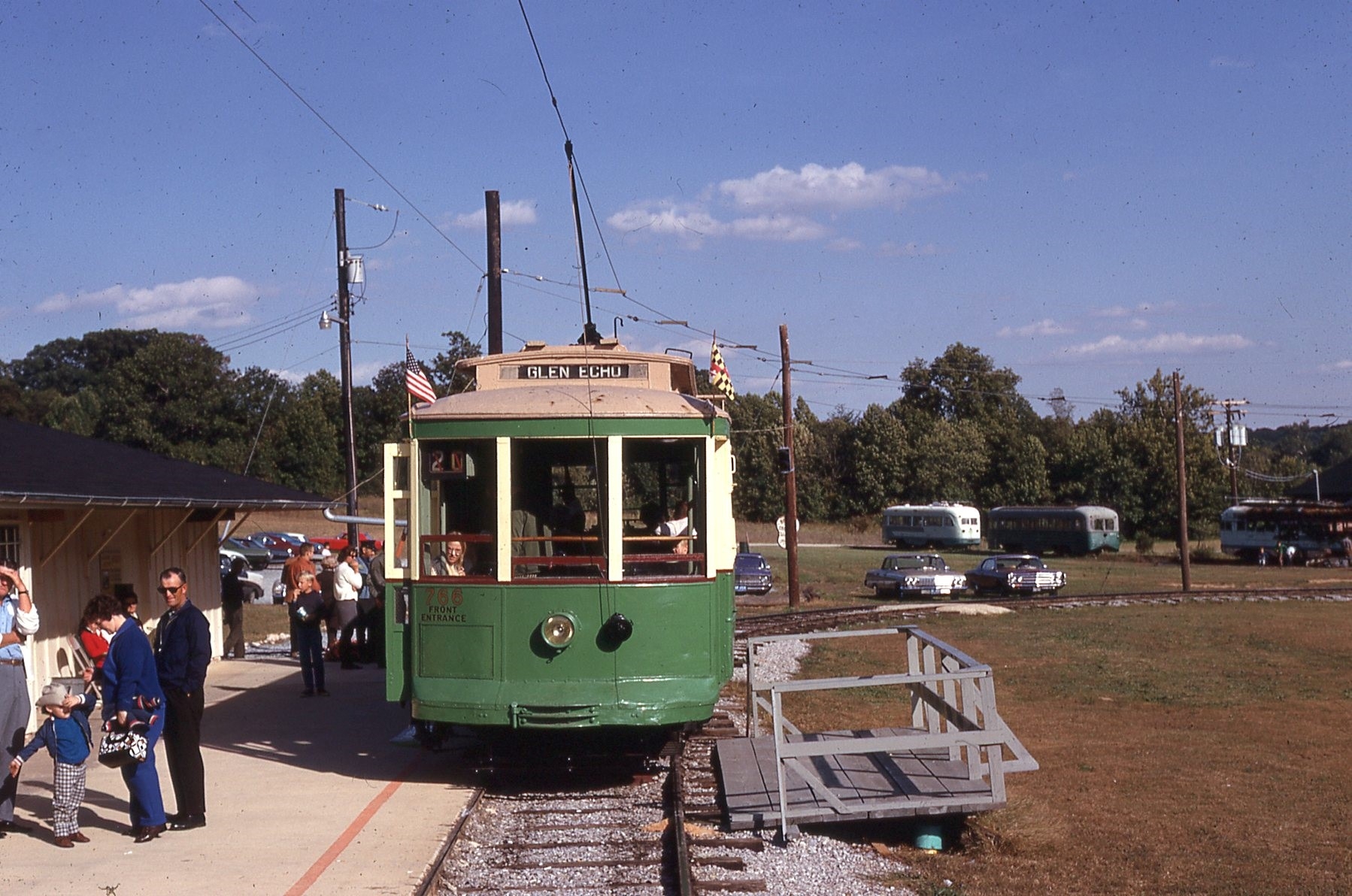 NCTM Wheaton, MD #766 and #1101 Visitor Center, Both ex-capital Transit, #766 made by Kuhlman 1919, former capital traction car #27, Dodge loop boardering platform and layover point. March 1987 - #73