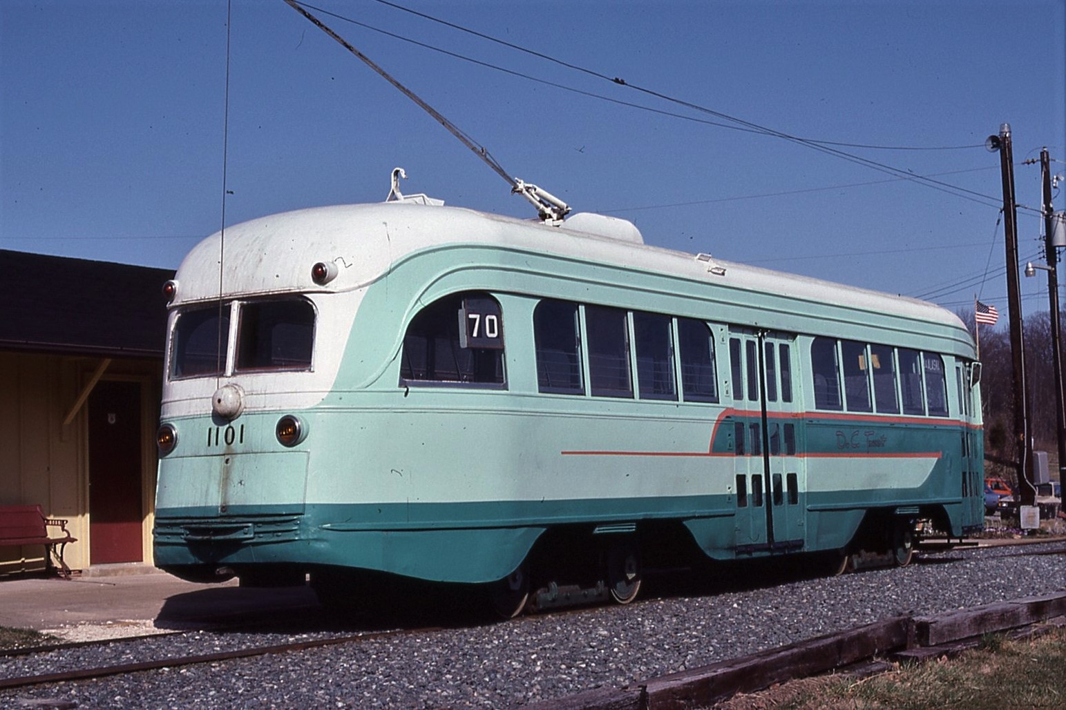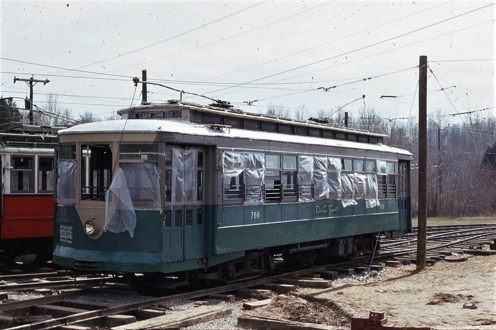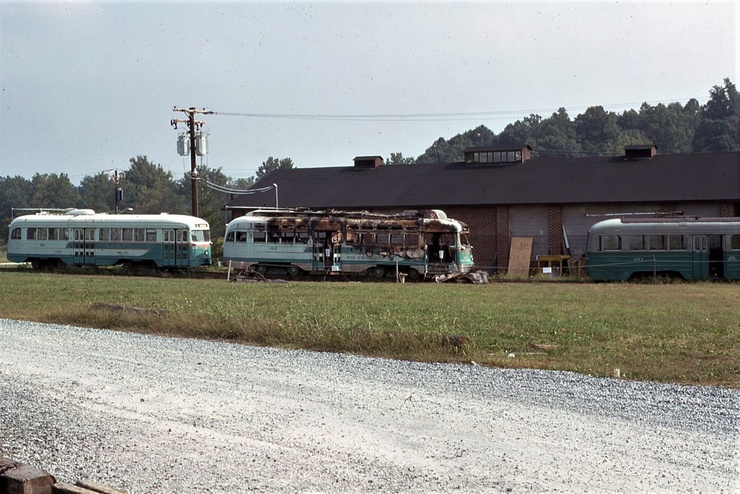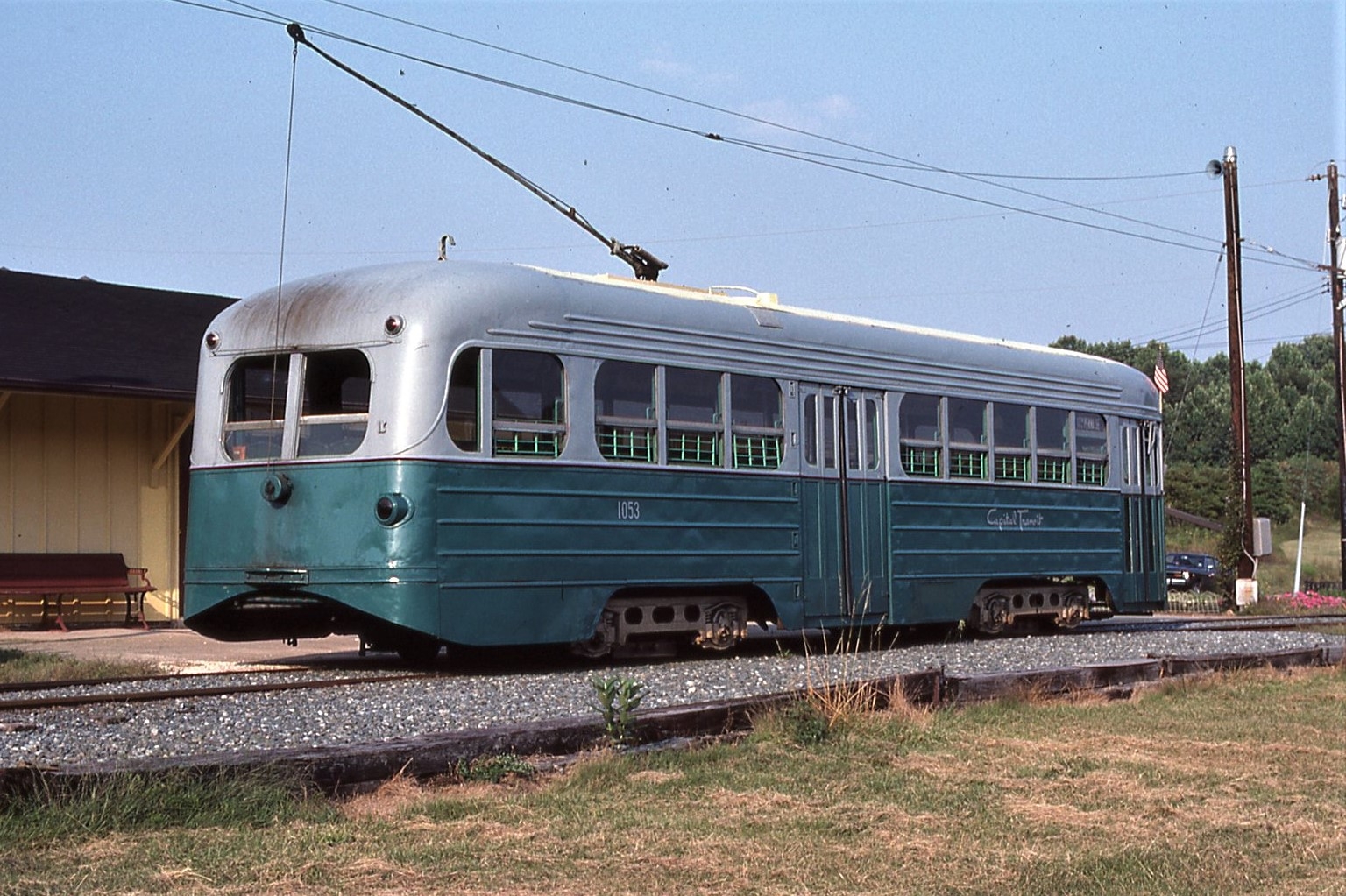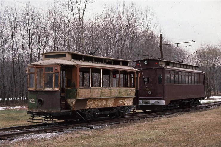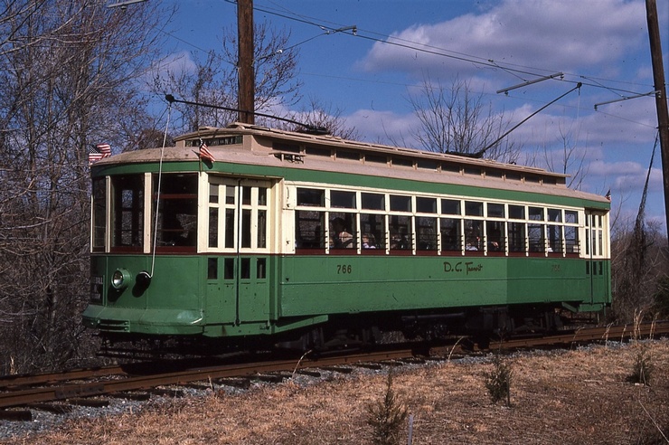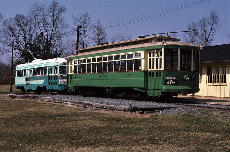 NCTM Wheaton, MD #766 and #1101 Visitor Center, Both ex-capital Transit, #766 made by Kuhlman 1919, former capital traction car #27, #1101 made by St. Louis PCC car 1937. taken March 1987 - #71